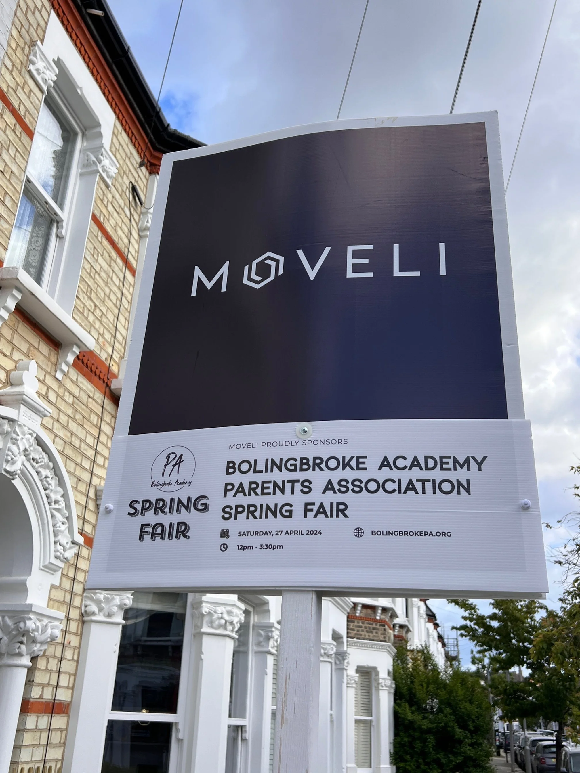 These are like a normal “For Sale” or “To Let” sign with the Moveli logo and a banner promoting a Bolingbroke PA event - it’s great to see our events advertised around the area!
